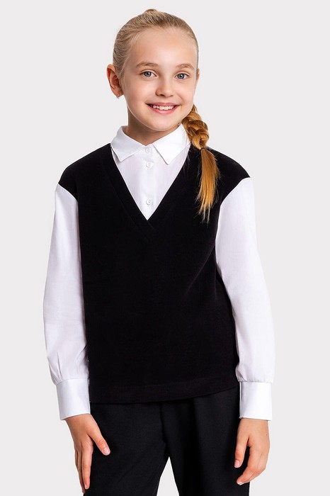 Джемпер свободного силуэта, с имитацией жилетки и рубашки. Жилет из селаника горловина V-образной формы. Рубашка из ткани горловина круглой формы, воротник с цельнокроенной стойкой. По переду центральная застежка на пуговицы. Плечо спущено, пройма углубленна. Рукава втачные, длинные из ткани. Низ рукава немного расширен и присборен, по низу рукава отрезная манжета из ткани. Низ изделия обработан швом в подгибку.