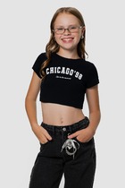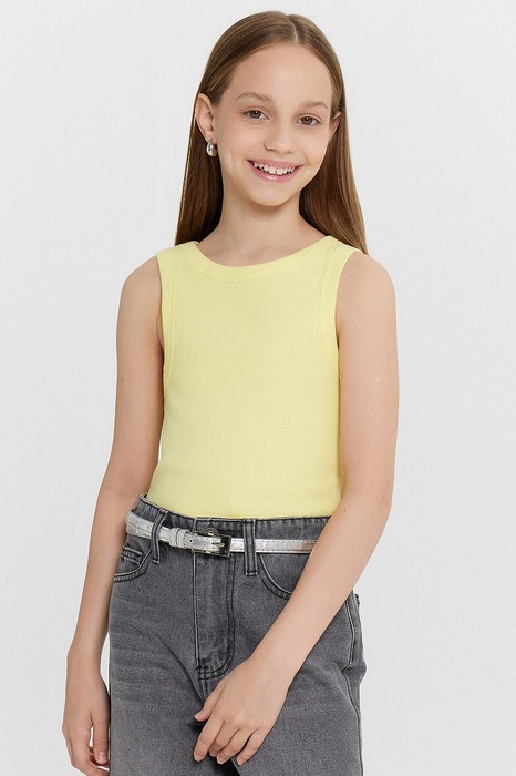 Топ для девочек из рибаны, облегающего силуэта, длиной ниже уровня талии. Перед и спинка цельнокроеные. Горловина круглая. Горловина и проймы окантованы широкой бейкой из основного полотна. Низ изделия обработан швом в подгибку.
