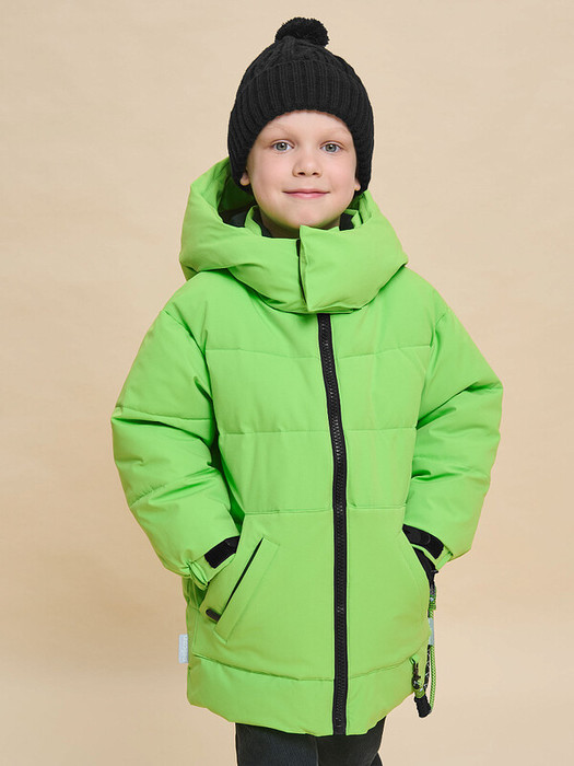 Пуховик зимний для мальчика, модель из мембранной ткани. На внешнюю поверхность материала нанесена водоотталкивающая пропитка (DWR), она задерживает грязь и влагу снаружи — ребёнок не промокнет от снега, а пуховик без проблем отстирается. Также есть дополнительная пропитка на внутренней стороне ткани — для оптимальной защиты от промокания. Куртка прямого оверсайз-силуэта подходит для любого типа фигуры. Капюшон с двумя швами, что обеспечивает анатомически правильную форму и комфортную посадку по голове. Капюшон не отстегивается, он красивый и объёмный за счёт дополнительного наполнителя в камерах, предусмотрена регулировка его объема эластичными шнурами с пластиковыми стопперами. По низу рукавов манжета, которая дополнительно застёгивается силиконовой патой на липучке (велькро) — удобно регулировать объем, быстро и просто застёгивать и расcтёгивать. Внутри рукава ветрозащитная манжета из трикотажного полотна с прорезью для большого пальца, которая позволяет придерживать рукав при надевании перчаток. Центральная застёжка на прочную тракторную молнию. Тканевый стоппер защищает подбородок от зажима молнией. Фиксирующая строчка предохраняет планку от «заедания» в процессе застёгивания. Зимний пуховик тёплый — для наилучшей защиты от ветра и холода центральная молния дополнительно закрыта внутренней ветрозащитной планкой. По низу объём изделия регулируется эластичным шнуром со стопперами. Пуховик на мальчика спереди дополнен карманами-кенгуру застёжками на магниты — ребёнку просто и быстро открывать и закрывать даже в варежках. Карманы внутри утеплены мягким флисом. Также есть дополнительные карманы на молнии с планкой — удобно пользоваться. Пуховик в трендовом стиле стритвир — для тех, кто понимает в моде. На левом кармане оригинальный декор — навесной шнур контрастного цвета. Он крепится с помощью двух карабинов за петельки из основной ткани в кармане и боковом шве куртки — при желании его можно снять. В каждой куртке нейм-лейбл! Ребёнок не потеряется и не потеряет куртку! На спинке и в боковых швах расположены светоотражающие  элементы — безопасность в тёмное время суток. Изделие неприхотливо в уходе — ухаживать согласно указанным на вшивных ярлыках рекомендациям. Пуховик однотонный, без принта. Куртка выполнена из полиэстера с мембраной — она не только отлично защищает от холода и влаги, но и хорошо пропускает воздух, позволяя коже ребёнка дышать. Подкладка из мягкого, тёплого и дышащего флиса (по стану, внутреннему воротнику и в капюшоне). В рукавах подкладка из тонкого и гладкого полиэстера —  благодаря этому ребенку легко надевать куртку, руки не путаются в рукавах, а словно проскальзывают в них. Куртка выполнена в красивых трендовых цветах, которые хорошо комбинируются с различными брюками. Куртка зимняя оверсайз идеальна для маленьких мальчиков дошкольного и младшего школьного возраста, а также подростков. Рекомендуемый температурный режим: не ниже минус 30 градусов. Утеплитель: экопух. В рукавах дополнительный слой тонкого синтепона  — для максимального тепла и комфорта. Куртка на мальчика подходит для носки в детский сад, школу, для прогулок и отдыха.