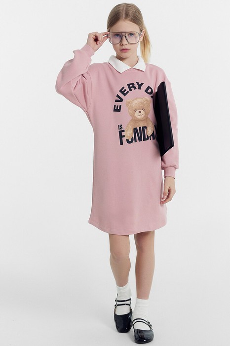Платье свободного силуэта. Перед и спинка цельнокроеные. Горловина круглой формы c окантовкой из трикотажного полотна рибаны. В горловину втачан вязаный воротник, шов втачивания закрыт х/б тесьмой. Рукава длинные, втачные. Линия плеча спущена. По низу рукавов притачные манжеты из трикотажного полотна рибаны. Низ изделия фигурный, обработан на 2-х игольной плоскошовной машине швом в подгибку. Длина платья выше колена.