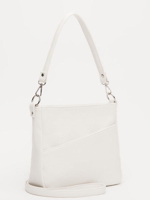 Геометричная форма с диагональным карманом и естественной складкой верха создаёт стильный женственный силуэт. В комплекте — съёмная короткая ручка и регулируемый ремень для разных вариантов ношения: в руке, на плече или через плечо.