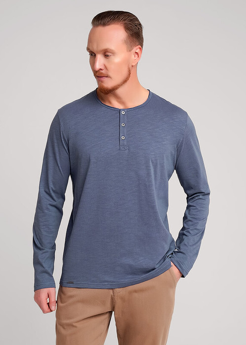 Лонгслив мужской с длинным рукавом, округлой необработанной горловиной на планке из фактурного полотна флам. Изделие дополнено имиджевой фурнитурой. Данная модель прекрасно комбинируется с джинсами или шортами благодаря своей универсальности.