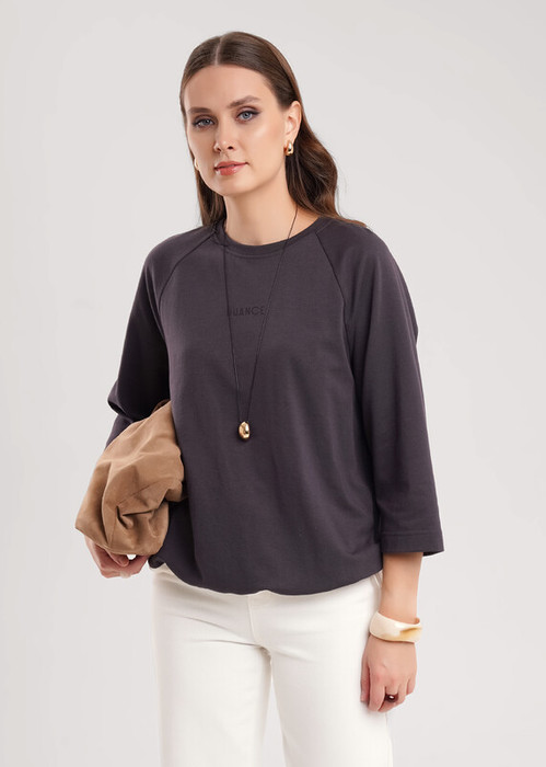 Джемпер свободного кроя из эластичного хлопкового полотна. Рукав реглан длиной 7/8. Округлая горловина с обтачкой. По низу изделия притачная контрастная кулиса с внутренним шляпным шнуром и стопором. Спереди принт.