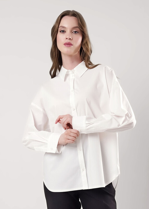 Блузка из текстильного полотна поплин,прямого силуэта на пуговицах с отложным воротником на стойке. По борту планка с пуговицами, по спинке кокетка со складками. Длинный рукав со спущенной линией плеча, внизу манжет с пуговицей. Низ изделия фигурный.