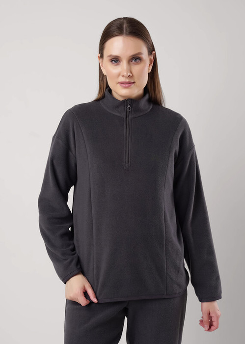 Джемпер спортивный прямого силуэта из трикотажного полотна флис. По горловине стойка с молнией. Спереди рельефы. Длинный рукав со спущенной линией плеча. По низу рукава и низа изделия окантовка. Спереди вышивка.