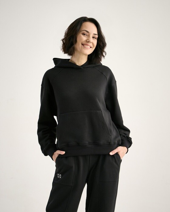 Худи женский свободного силуэта. Двойной капюшон с одним швом, притачные кокетки по переду, втачной рукав с локтевым швом. Карман "кенгуру".  Манжеты и пояс из кашкорсе.