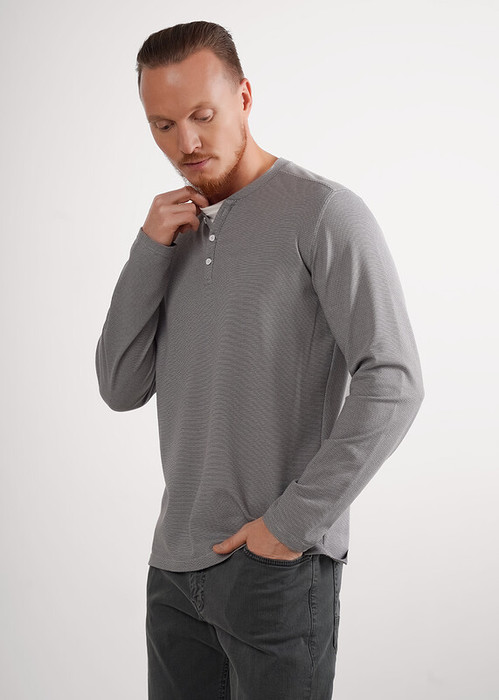 Мужской лонгслив из трикотажного фактурного полотна с длинным рукавом и декоративной планкой на пуговицах. Контрастная отделка горловины акцент. Удобная и стильная модель для повседневного образа.