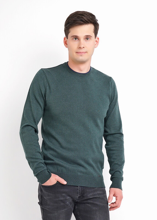 Мужской вязаный джемпер с круглым вырезом горловины в базовом ассортименте. Модель завершенная благодаря двойной контрастной горловине, декоративной полосатой тесьме и провязаной обтачке по спинке. Модель дополняет металлофурнитура по низу.
