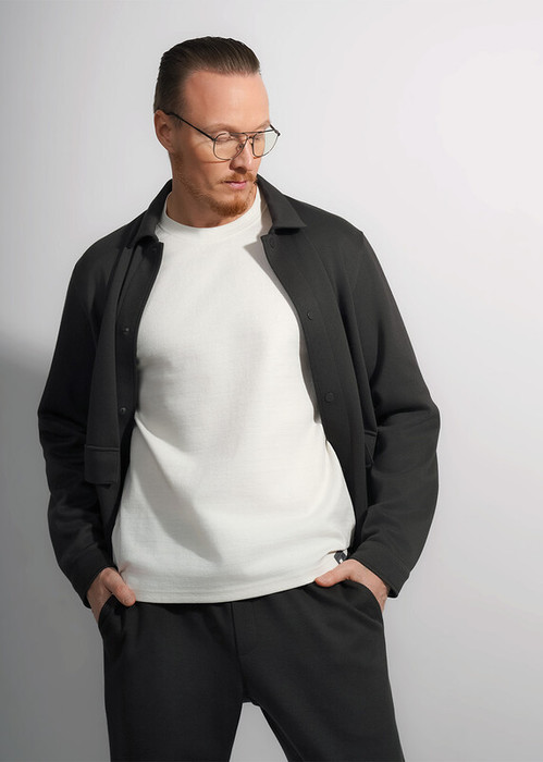 Мужская куртка-рубашка выполнена из фактурного трикотажного полотна, свободного силуэта с отложным воротником и застежкой на кнопки. Модель дополнена накладными карманами. По низу рукава манжета. Отлично подойдет для работы и учебы.