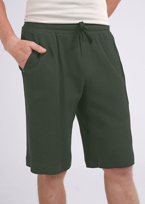 Шорты мужские из фактурного трикотажного полотна вафельного переплетения на широком поясе с резинкой и регулируемым шнуром, по бокам удобные карманы. Отличное решение для создания стильного домашнего образа.