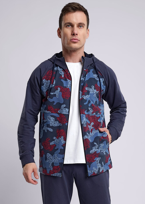 Куртка мужская комбинированная из плотного футера. Изделие на капюшоне с вместительными карманами, дополнена фирменной фурнитурой, рукава покроя реглан с манжетом по низу. Удобный и практичный вариант на каждый день.