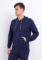 Модная куртка с капюшоном на молнии из плотного трикотажного полотна будет незаменимой вещью в гардеробе любого мужчины, благодаря функциональным карманам "кенгуру" и стильной отделке в виде нашивок.