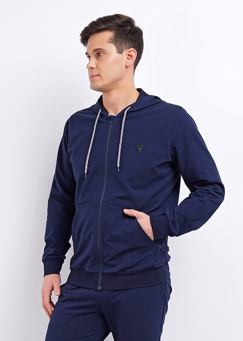 Модная куртка с капюшоном на молнии из плотного трикотажного полотна будет незаменимой вещью в гардеробе любого мужчины благодаря функциональным карманам "кенгуру" и стильной отделке изделия.