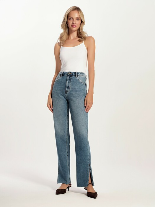 Джинсы straight получится отлично интегрировать в различные casual образы. Разрезы по внешнему шву, необработанный край и эффект потертостей придадут образу небрежную элегантность.