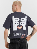 Фуфайка с коротким рукавом среднего объема, с оригинальным принтом, круглым вырезом горловины, которая оформлена обтачкой из рибаны.