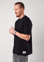 Фуфайка с коротким рукавом среднего объема, с оригинальным принтом, круглым вырезом горловины, которая оформлена обтачкой из рибаны.