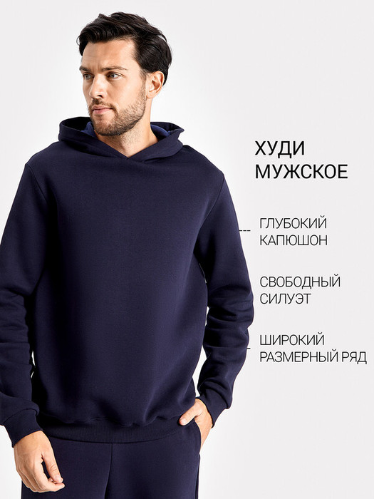 Мужское худи прямого силуэта, слегка посаженное на пояс. Выполнено из трикотажного футера с теплым подчесом. Горловина круглая, с уютным капюшоном, который спереди идет внахлест. Рукава длинные, на манжетах. Есть вместительный карман-кенгуру. Слегка спущенная линия плеча и немного углубленная пройма дарят свободу движений. Отличное худи для стильных образов!
