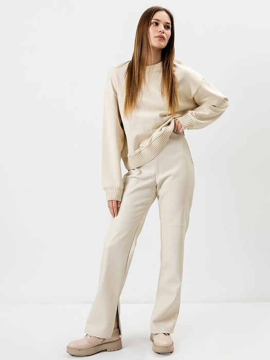 Брюки женские прямого силуэта из трикотажного полотна под «кожу». Пояс цельнокроенный внутри обработан жаккардовой тесьмой. В боковом шве обработана застежка на молнию. На задней детали вытачки. На передних деталях членение чуть выше колена.