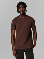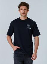 Футболка свободного силуэта. Перед и спинка цельнокроеные. Горловина круглой формы. Обтачка горловины из рибаны 1*1. По горловине проложена отделочная строчка. Горловина спинки закрыта тесьмой из основного полотна. Плечо спущено, пройма углублена. Рукав втачной, длина рукава чуть выше локтя.