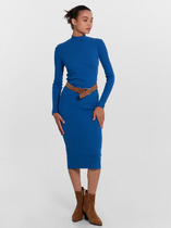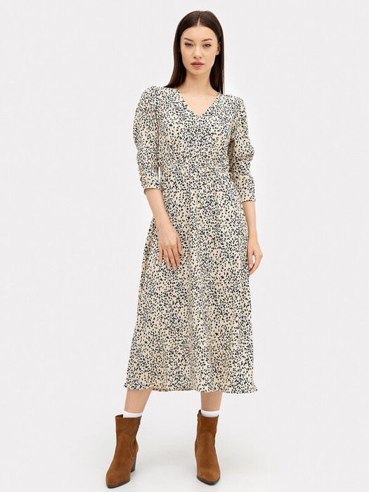Платье полуприлегающего силуэта из ткани рошель. Горловина V-образной формы. Платье отрезное по талии, с эластичной тесьмой внутри. По эластичной тесьме проложены отделочные строчки. По детали переда средний шов. Детали спинки со средним швом. Рукав втачной, длинный. По окату слегка присборен. Длина рукава  3\4, по низу рукава настрочена эластичная тесьма которая делает сборку. Низ платья расширяется к низу. Длина платья ниже колена.