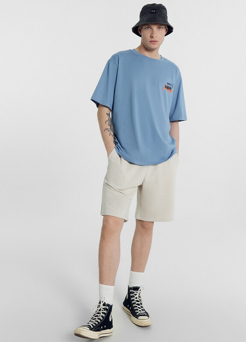 Шорты мужские прямого силуэта из трикотажного полотна футер. Пояс отрезной из основного полотна с эластичной тесьмой внутри. По поясу проложены отделочные строчки. По внутренней части пояса втавлен кругловязаный шнур. В боковых швах обработаны карманы с отрезным бочком, подкладка карманов кулирка.