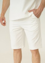 Шорты прямые свободные, посадка средняя. Пояс отрезной с эластичной тесьмой внутри (внутренняя резина. По переду пробиты петли и втянут шнур-бейка из основного полотна с застроченными концами. В боковых швах обработаны карманы. По переду обработан гульфик с супатной застежкой на петли и пуговицы. На задней правой половинке накладной карман. Нижние срезы шорт обработаны швом вподгибку с закрытым срезом.