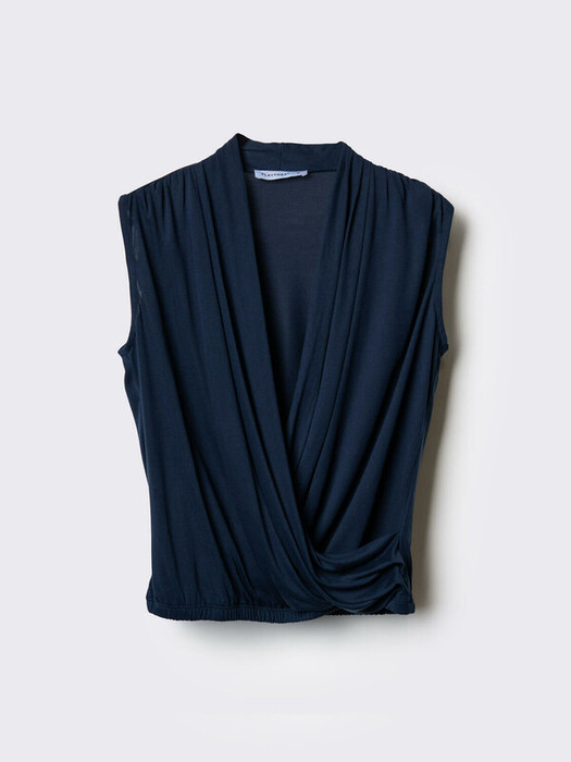Женский топ без рукавов. Выполнен из мягкого эластичного трикотажа. Спереди — глубокий запах с драпировкой, придающей изделию объём. На спинке — скрытая застёжка-молния. Низ обработан внутренней резинкой для комфортной посадки.
