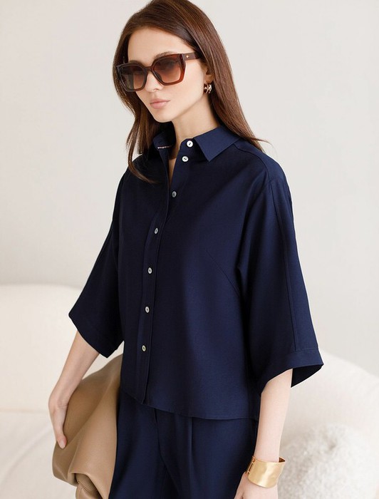 Стильная блузка темно-синего цвета выполнена из плотного лиоцелла.  Лиоцелл это более дорогой и экологичный вариант вискозы, очень прочный и шелковистый. Модель дополнена широкими рукавами длиной 3/4, создающими модный акцент. Классический отложной воротник придает блузке официальность и идеально подходит для ношения, где требуется офисный дресс-код. А лаконичные лампасы вдоль рукавов в тон основного цвета подчеркивают трендовый характер блузки. Это ненавязчивый, но заметный акцент, который выделяет модель среди стандартных классических блузок. Свободный крой не сковывает движений и отлично садится по фигуре даже на большие размеры, скрывая возможные недостатки. Эта легкая рубашка с застежкой на пуговицы идеальный выбор для комфорта и стиля в теплое время года, она идеально подойдет для любого повода.