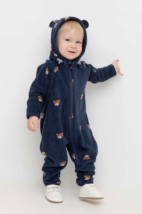 Флисовый комбинезон со съёмным капюшоном для мальчика. У изделия высокий воротник и съёмный капюшон на кнопках с декоративными ушками и подкладом из супрема. Застёгивается на удлинённую молнию. Предусмотрена защита шеи и подбородка. В размерах 40/62 - 48/74 на рукавах и штанинах есть удобные отвороты. Оригинальная набивка выполнена из стойких, гипоаллергенных текстильных красителей. Комбинезон сохраняет цвет и форму после многократных стирок.