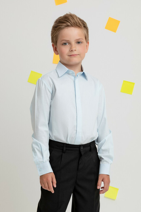 Классическая сорочка для мальчика с отложным воротником. Застегивается спереди на планку с потайными пуговицами. Длинные втачанные рукава с манжетами регулируются по ширине.