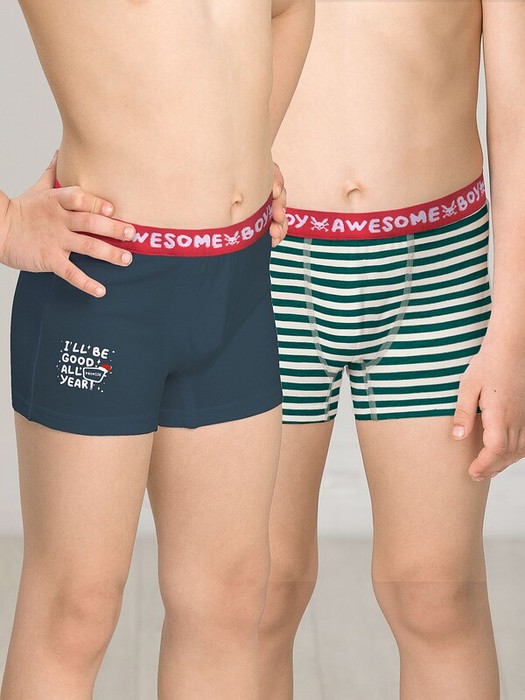 Детские трусы шортики для мальчика, набор 2 штуки с новогодним принтом и надписью на резинке. Составляя детский гардероб, очень важно подобрать комфортные и удобные трусы для детей и подростков для повседневной носки на каждый день и сна. Детские трусы шорты для подростка с эластичной резинкой по талии надежно держатся на теле ребенка, не скручиваются, не закатываются и не сползают, а дышащая ткань позволяет избежать натирания нежной кожи. Добавление эластана делает трикотажные трусы боксеры эластичными и более удобными при надевании. Плотная, но свободная модель и средняя посадка не сковывают движения парня, что важно маленьким детям. Милое и практичное детское нижнее белье порадует родителей долговечностью. Хлопковые подростковые повседневные трусики шортики не боятся многочисленных стирок, не растянутся и не полиняют. Детская одежда для мальчиков должна отвечать моде, комплект трусы для малыша представляет только молодежные цвета, которые порадуют и поднимут настроение современному мальчику.