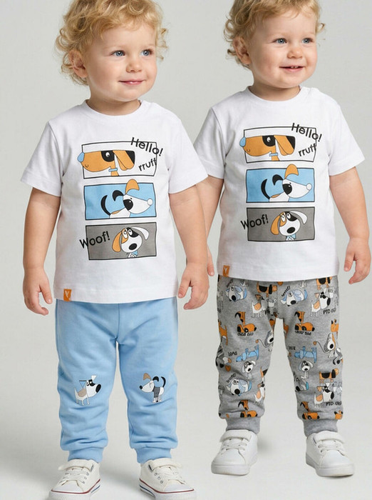 Набор детских брюк для мальчика. Комплект из 2 брюк выполнен из хлопкового трикотажа интерлок. Модель прямого кроя со средней посадкой на талии. Пояс выполнен на широкой мягкой резинке. В нижней части брючин предусмотрены эластичные трикотажные манжеты для лучшей посадки. Принты с милыми собачками.