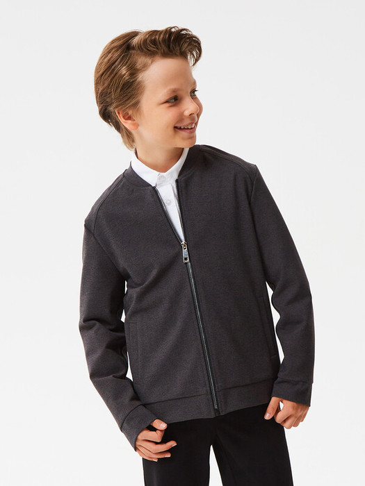 Классический трикотажный бомбер для мальчика из смесовой вискозы свободного силуэта с воротником-стойкой и длинным втачным рукавом. Дополнен карманами в боковых швах. Манжеты на рукавах и низ бомбера оформлены резинкой. Застёгивается на металлическую молнию.