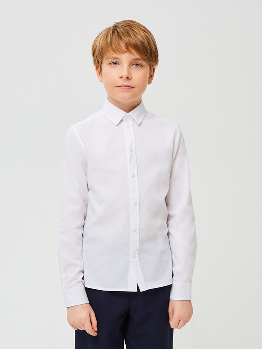 Сорочка для мальчика из смесового хлопка полуприлегающего силуэта. На спинке - кокетка. Воротник отложной со стойкой. Застёжка по центру переда на планку с пугавицами. Рукава рубашечные со шлицами и манжетами.