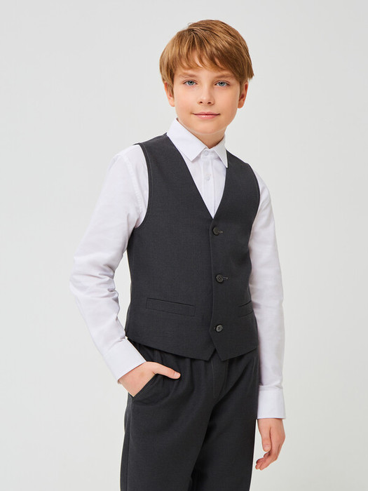Жилет из смесовой вискозы на вискозной подкладке для мальчика с V-образным вырезом и боковыми прорезными карманами с листочкой . Спинка дополнена хлястиком с металлической пряжкой для регулировки жилета по полноте. Застегивается на три пуговицы.