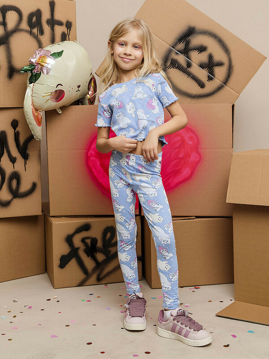 Леггинсы для девочки из эластичного хлопкового трикотажа. Нежно голубые леггинсы с принтом станут незаменимы в повседневной жизни, подойдут для спорта и прогулок. Вшитая в пояс резинка не врезается в талию, дышащий материал не сковывает движения, благодаря входящему в его состав эластану, а удобная посадка создаст чувство комфорта в течение всего дня.Характеристики:Ткань: Супрем пенье 92% хлопок 8% эластанПроизводитель: batik