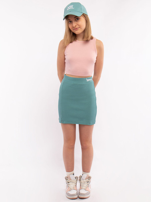Юбка для девочки из кашкорсе короткая в мятной расцветке. Юбка-мини облегающая с эластичным поясом, украшенном небольшой нашивкой.