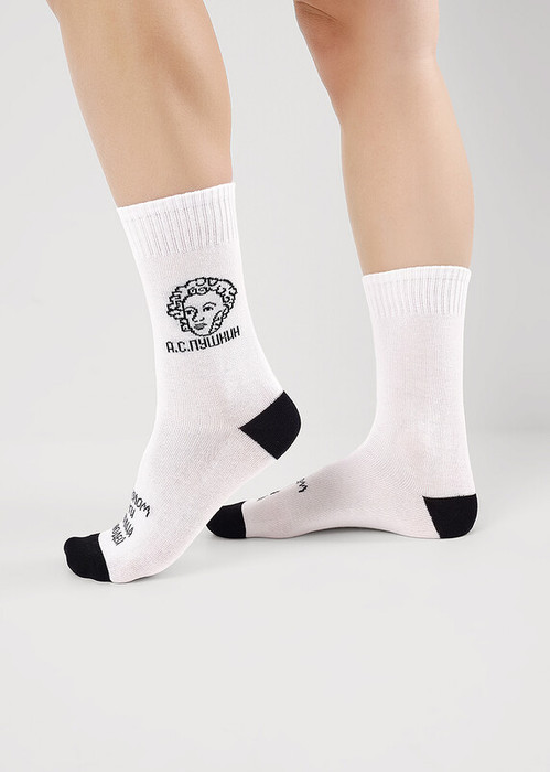 Носки для мальчика и девочки с выделенным мысом и пяткой с изображением А.С.Пушкина и надписью Глаголом жги сердца людей