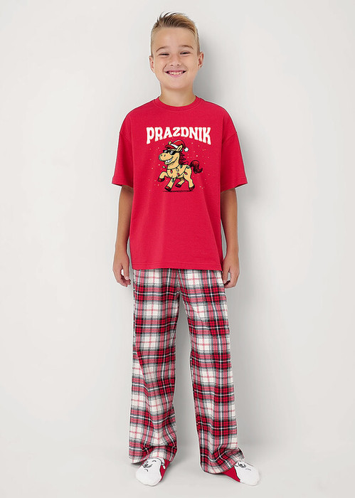 Новогодняя пижама для подростков,состоящая из футболки и брюк. Футболка свободного кроя спереди украшена тематическим принтом. Брюки прямые среднего объема с эластичным поясом.