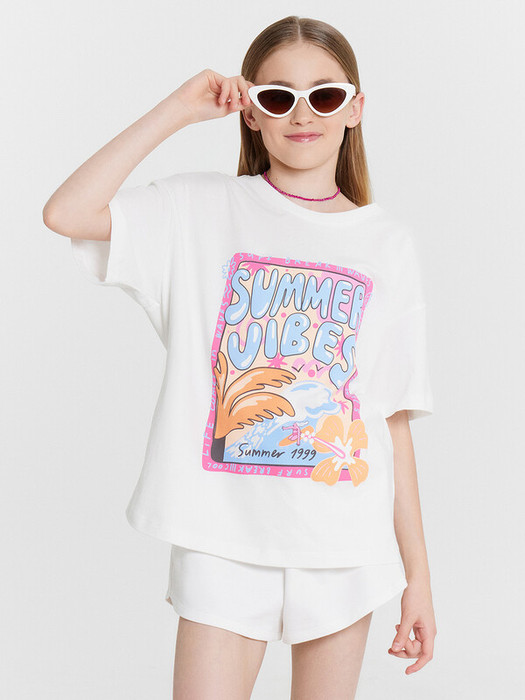 Футболка из трикотажного полотна кулирного переплетения. Силуэт свободный, длина до середины бедра. Рукава короткие, горловина круглая. Дизайн футболки наверняка понравится вашей моднице!