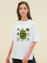 Футболка свободного силуэта. Перед и спинка футболки цельнокроеные. Рукава короткие втачные. Линия плеча спущена. Горловина круглой формы, обтачка из трикотажного полотна рибаны. Шов втачивания рибаны по спинке закрыт бейкой из основного полотна. Низ футболки и рукавов обработан швом в подгибку.