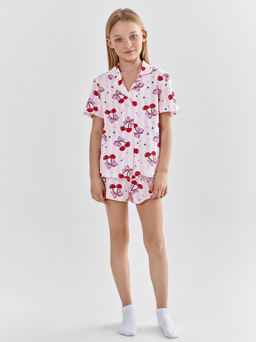 Комплект состоит из рубашки и шорт. Рубашка прямого силуэта, с отложным воротником, спинка цельнокроеная. Плечо слегка спущено. Рукав втачной, одношовный, короткий. Центральная застежка на пуговицы.
