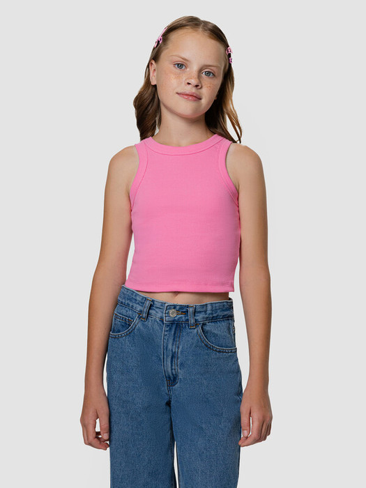 Топ для девочек из рибаны, облегающего силуэта, длиной ниже уровня талии. Перед и спинка цельнокроеные. Горловина круглая. Горловина и проймы окантованы широкой бейкой из основного полотна. Низ изделия обработан швом вподгибку.