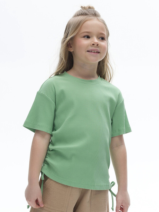 Футболка из модной ткани в рубчик для девочки. Благодаря преобладающим в составе хлопку и вискозе ткань изделия дышит и приятна на ощупь.  Эластан помогает сохранять форму. По бокам модели кулиски с тесьмой — актуальный тренд. С их помощью можно делать стильную сборку с одной или двух сторон. Такая футболка хорошо сочетается с различными шортами, леггинсами, кюлотами или джоггерами.
