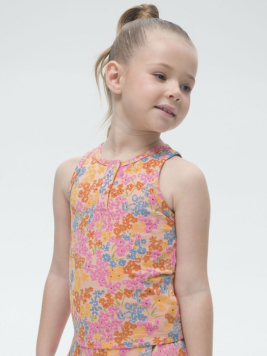 Модный топ-хенли прилегающего силуэта для девочки. Неглубокий вырез горловины, проймы сдвинуты к горловине — самый актуальный летний тренд. В составе ткани преобладает хлопок — топ мягкий и очень комфортный. Эластан в составе ткани помогает изделию сохранять форму. У горловины планка с застёжкой на кнопки. С ней справится даже самый маленький ребенок. Легко надевать и снимать. Топ прекрасно сочетается с различными моделями шорт и юбок. Майку украшает нежный цветочный принт.