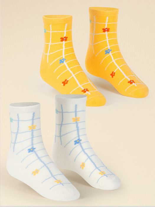 Стильный набор детских носков. В комплект входят 2 пары. Мягкая резинка не пережимает ногу, при этом носки надёжно зафиксированы и не сползают. В составе ткани преобладает хлопок — носки мягкие, отлично пропускают воздух, позволяя коже ребенка дышать. Благодаря полиэстеру и эластану носки износостойкие, хорошо тянутся, прекрасно переносят многочисленные стирки. Милые носки подходят для повседневной носки в школу, детский сад, а также для спортивных тренировок и прогулок. Одна пара в наборе жёлтого цвета, вторая — белого. Обе пары украшает вытканный узор в виде клетки, будто нарисованной от руки, и цветочков. Модные носки станут отличным дополнением образа. Размерная линейка: 12-14, 14-16, 16-18, 18-20, 20-22. Подходят для круглогодичного применения. Набор носков детских станет отличным подарком для ребёнка на любой праздник. Выбирайте нужный размер по таблице размеров на фото. Цвет товара на экране вашего устройства может отличаться от цвета изделия вживую. Товар возврату и обмену не подлежит.