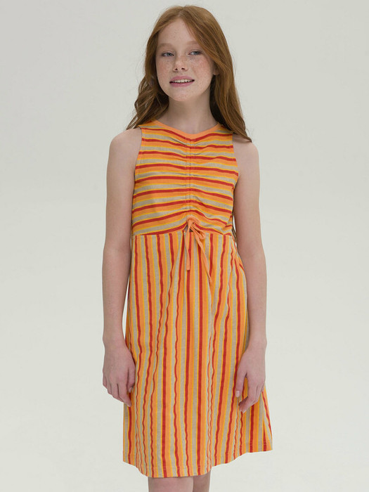 Стильное комфортное платье для девочки - лучшая модель для повседневной носки. Выполнено из натуального хлопка, материал не вызывает аллергии, а тело ребенка всегда дышит. Платье А-образного силуэта, без рукава - в нем не будет жарко. Оригинальное решение - сборка на планке спереди, которая позволяет слегка увеличить размер горловины. Разные направления полосок - модный акцент, который не оставит без внимания и выделит среди сверстников. Идеально, для пляжа, прогулок, детского сада и путешествий.