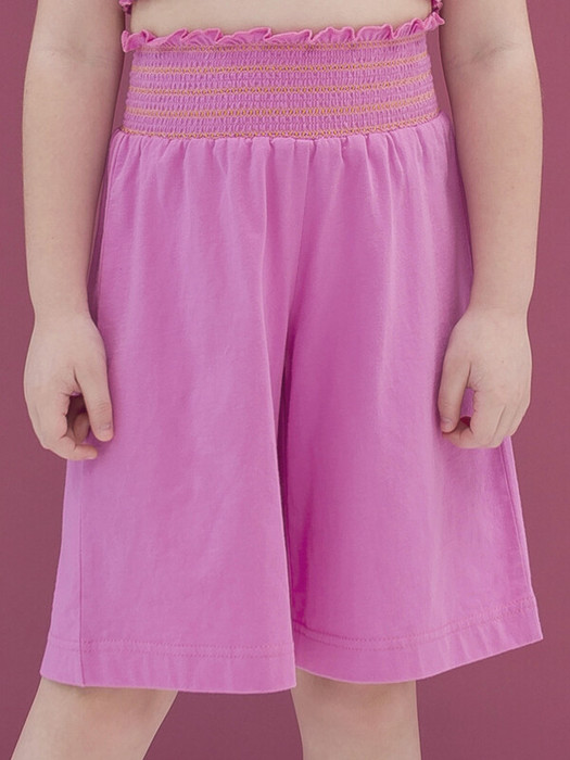 Шорты-бермуды из 100% хлопка для девочки. Натуральный состав ткани и свободный крой обеспечивают комфорт вашему ребёнку. Изделие приятное на ощупь и отлично подходит для жаркой погоды. Пояс модели украшает горизонтальная сборка контрастными нитками с деликатным рюшем вверху — актуальный летний тренд. Такие шорты будут носиться долго. Ребёнок растёт, и они словно "растут" вместе с ним. Однотонные яркие бермуды легко сочетать с топами и футболками различных силуэтов и расцветок.