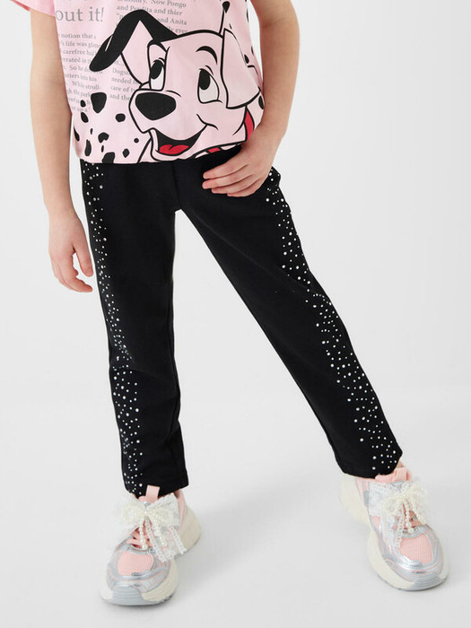 Детские спортивные брюки для девочки. Выполнены из хлопкового трикотажа под деним. Модель с комфортной высокой посадкой и прямым кроем. Пояс на широкой внутренней резинке обеспечивает хорошую посадку по фигуре. Спереди и сзади — два кармана. Основной декоративный элемент — это россыпь блестящих страз, аккуратно размещённых по бокам.