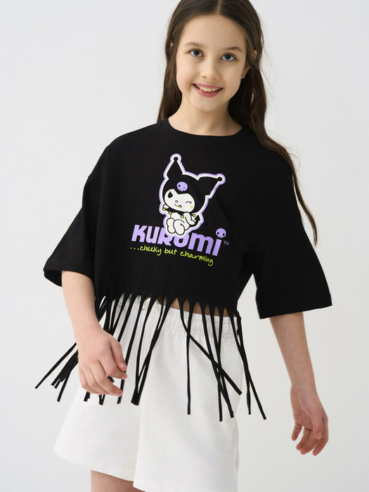 Футболка оверсайз для девочки подростка. Модель укороченная, выполнена из меланжевого хлопкового трикотажа джерси. На груди расположен крупный принт с любимым персонажем Куроми. По низу декоративная бахрома.